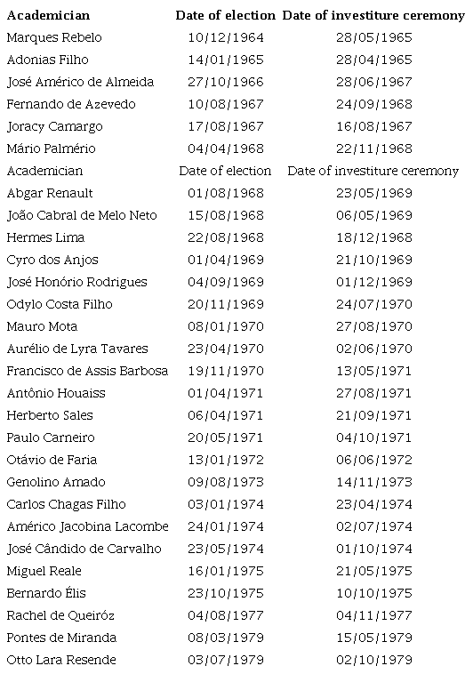 Between 1964 and 1979, 28 personalities were elected to the ABL. The following table indi- cates who they were, as well as the date they were elected and the date of their investiture ceremony.