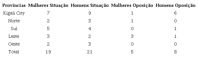 Podemos observar que existe um equilíbrio entre o número de deputadas e deputados governistas em todas as regiões ruandesas, o que não ocorre na oposição, principalmente entre os deputados oposicionistas de Kigali, em que seis são homens e apenas uma é mulher. É possível que essa diferença seja ocasionada devido à atomização de partidos oposicionistas que com a baixa margem de manobras acabe dando mais espaço para as lideranças participarem dos pleitos, a qual é composta majoritariamente por homens.