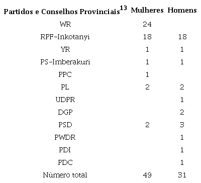 Outro aspecto relevante que os dados nos permitem questionar é que, apesar das medidas implementadas em Ruanda, nem todos os partidos políticos estão promovendo a equidade de gênero. De fato, gênero é uma categoria importante na análise das práticas nas organizações e instituições (SCOTT, 1990). Dessa forma, os partidos podem se apresentar como organizações mais resistentes à igualdade de gênero. É o caso do Democratic Green Party, que conquistou duas cadeiras e ambas foram ocupadas por homens, e dos partidos PDI e PDC, que conquistaram somente uma vaga cada e foram preenchidas por homens em ambos, como pode ser observado na tabela a seguir.