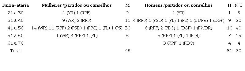 Mais do que a igualdade na distribuição das cadeiras, observamos que a maioria das cadeiras foram ocupadas por mulheres. Isso pode ser visualizado ao verificarmos a distribuição das cadei- ras ocupadas pelos homens e constatamos a inexpressiva participação dos Conselhos, pois das 31 cadeiras ocupadas por candidatos homens, 29 deles estavam vinculados aos partidos políticos e adquiriram o mandato com a participação no pleito com eleições proporcionais, enquanto um homem foi indicado pelo Conselho Nacional da Juventude (YR) e um pela Federação das Associações de Pessoas com Deficiência (PWDR). Na tabela a seguir podemos observar a distribuição das 53 cadeiras vinculadas aos partidos políticos, preenchidas a partir da eleição proporcional, e seu posicionamento político em relação ao governo.