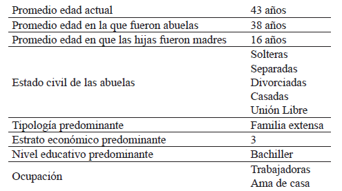 De acuerdo a la información analizada, de las doce entrevistadas fue posible establecer que el promedio de edad actual fue de 43 años y el promedio de edad en la que fueron abuelas giró alrededor de los 38 años. En cuanto a las hijas, se evidenció que el promedio de edad en el momento de ser madres fue a los 16 años. En el estado civil, se encontró que las participantes contaban con diversidad en este aspecto: solteras, separadas, divorciadas, casadas y en unión libre; estos dos últimos representan la mitad de las entrevistadas. La tipología familiar predominante fue la familia extensa o aquella compuesta por tres generaciones, la mayoría de las abuelas vivían con los nietos pero no en todos los casos con la madre de éstos. Por otro lado, la mayoría terminó el bachillerato, una cantidad considerable de ellas trabajan actualmente y el mayor número de las participantes residen en el estrato tres.