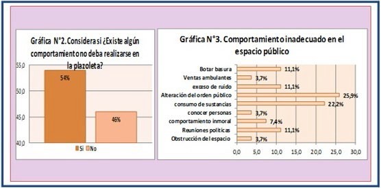 Del total de los ciudadanos que respondieron, el 54% señaló que sí consideraban que había comportamientos inadecuados y un 46% señaló que no. De aquel 54% de las personas que respondieron afirmativamente, un 25% señala las alteraciones del orden público (peleas, disturbios, problemas) como el comportamiento más indebido, un 22,2% de ellas indicó el consumo de sustancias psicoactivas, y un 11,1% el botar basura, el exceso de ruido y las reuniones políticas para cada una. De otro lado, un 7,4% de respuestas corresponde a lo que se reconoce como comportamiento inmoral; finalmente, las opciones obstrucción del espacio, ventas ambulantes y conocer personas muestran un equivalente a 3,7% cada una.