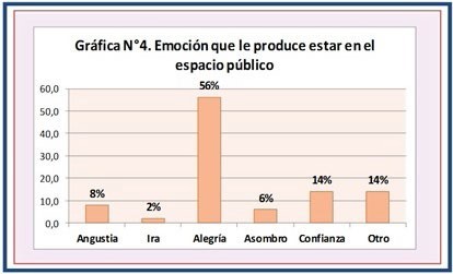 De otro lado, cuando se indagó acerca de la emoción que le produce a los ciudadanos estar en un espacio público se obtuvo que el 56% de los encuestados señala sentir alegría, seguido de un 14% que siente confianza, un 8% angustia, un 6% asombro, un 2% ira y el 14% de las personas restantes indicó que siente otra emoción. De este 14%, el 4% de los ciudadanos respondió que siente tranquilidad, y el 10% restante siente que depende de la situación; esparcimiento, prevención, relajamiento y tristeza correspondiente a un 2% cada una.