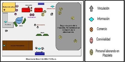En la anterior imagen se ilustran los usos que la ciudadanía le ha dado a la plazoleta y dan cuenta de la manera de relacionarse con el lugar de acuerdo a los significados construidos en torno a ella y a las posibilidades que la misma ofrece. Según Monnet (2009), es así como este tipo de espacios pueden llegar a convertirse en una representación simbólica de la ciudad.