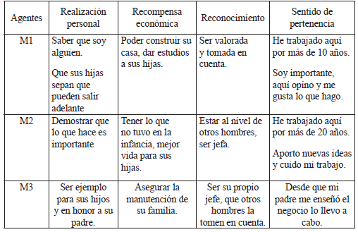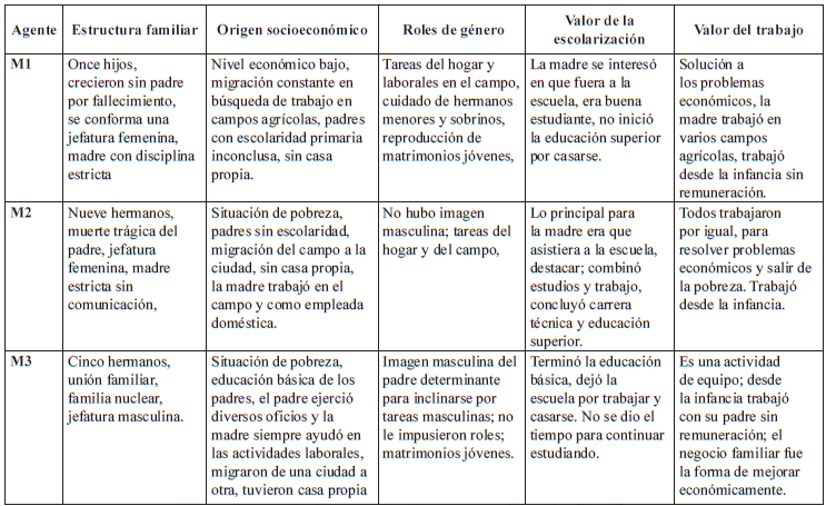 Las mujeres participantes comparten dinámicas familiares similares que son reconocidas por ellas en el discurso al explicar las motivaciones para convertirse en agentes reflexivos de su acción en el mercado laboral con la intención de ser reconocidas y obtener beneficios que el ámbito privado no les proporcionó. Dos de ellas refieren proceder de hogares con jefatura femenina, y la tercera, si bien tuvo una jefatura masculina en su familia menciona “mi madre siempre acompañó a mi padre en el trabajo: él mataba un puerco, mi madre hacía la barbacoa y mi padre la vendía. Para cada actividad que mi padre realizó, ella lo ayudó en todo” (M3).