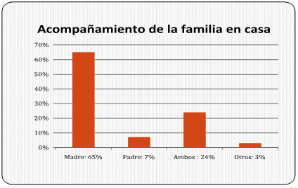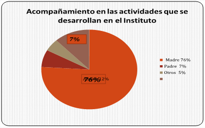 El acompañamiento es vital para que el proceso de rehabilitación fluya y tenga éxito, este se da en dos momentos. El primero es en el hogar (ver Figura 1) cuando la familia se involucra con el cuidado, las tareas, las actividades parentales y con la presencia emocional. El otro momento se da en el Instituto (ver Figura 2), el cual implica la presencia de la familia en las diferentes actividades que se realizan, como citas, escuelas de padres, entrega de boletines u otros eventos. En los datos analizados se encuentra que la madre en el 65% de los casos lidera el acompañamiento en el hogar y el 76% sigue liderándolo en el Instituto. Si se compara con la participación del padre, prácticamente queda en una posición marginal porque tanto en el instituto como en la casa solo llega al 7%.