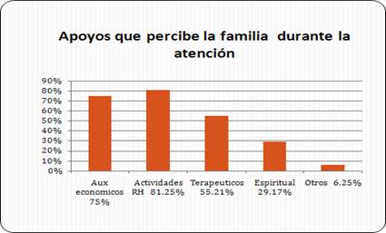 Se consideró importante revisar los apoyos que identifican los cuidadores como una ayuda que les permite sobrellevar las demandas del cuidado (ver Figura 3). Revisando los datos de la encuesta se reconoce como el principal apoyo las actividades de Rehabilitación, en ello coincide el 81.25% de las personas entrevistadas. En segundo lugar, identifican los auxilios económicos otorgados por el Instituto Colombiano de Bienestar Familiar (ICBF) y el Programa Padrinos, representados por el 75%, y en tercer lugar el apoyo terapéutico representado en el 55.21%. En un cuarto lugar, el 29.17% menciona el apoyo espiritual (que puede ser emocional).