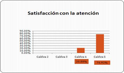 Por último, se consideró importante identificar el nivel de satisfacción del cuidador con el proceso de rehabilitación para lo cual se les solicito calificar de 1 a 5, siendo 5 la mayor calificación (véase Figura 4). Se encontró que el 76.92% lo califica como excelente y por ello le dieron la máxima calificación de 5.0, el 20.88% lo califica como bueno dándole una calificación de 4. Si se suman estos dos porcentajes se encuentra que la calificación oscila entre buena y excelente en el 97.8% de las personas entrevistadas lo cual evidencia un buen nivel de satisfacción.