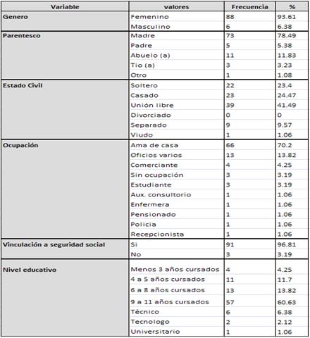 Para conocer características y condiciones de la persona que cuida, se realizaron 94 entrevistas en el momento de la matrícula para el periodo 2016. Este grupo poblacional por sus condiciones socio económicas y familiares tiene riesgo social y, por tanto, apoyo del Programa del ICBF. La información fue recolectada por el Departamento de Trabajo Social del INCYS, mediante la actualización de los estudios socio económicos y la aplicación de una encuesta en la cual se analizaron: Variables para conocer las características socio demográficas: parentesco, genero, ocupación, estado civil, escolaridad y seguridad social. Variables para identificar la frecuencia del acompañamiento que realiza la persona que cuida: acompañamiento en casa y acompañamiento en el Instituto. Variables con relación a: los tipos de apoyo que recibe la persona que cuida, en el Instituto, auxilios económicos, actividades de rehabilitación, actividades terapéuticas y apoyo emocional o espiritual. Apoyos extramurales con su familia u otras redes sociales.