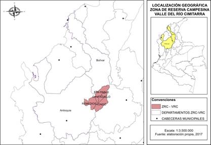 El presente análisis se desarrollará sobre la Zona de Reserva Campesina del Valle del río Cimitarra (ZRC-VRC), que comprende los municipios de Cantagallo, San Pablo (Bolívar), Remedios y Yondó (Antioquia) (Véase Mapa 1). La Resolución 028 de 2002 del Instituto Colombiano de Desarrollo Rural, INCODER, mediante la cual se crea la ZRC-VRC, establece la casi totalidad del municipio de Yondó como parte de esta figura legal, sin embargo, los municipios de San Pablo, Cantagallo y Remedios en los que se ha desarrollado el proceso de colonización campesina y en los que la organización comunitaria también reivindica la ZRC-VRC, aún permanecen bajo la figura de Zona de Reserva Forestal (ZRF) de la ley 2 de 1959, siendo incompatible la existencia de las dos figuras legales en un mismo territorio. Por ello, se habla de ZRC-VRC constituida, es decir, la establecida en la Resolución 028 de 2002 del INCODER y la ZRC-VRC de hecho, es decir, en la que el proceso organizativo de las comunidades reivindica la figura. Además, es importante aclarar que meses después de constituida la ZRC-VRC en el 2002, la figura fue suspendida por el Gobierno Nacional, y solo en el 2011 dicha suspensión fue levantada (Agencia Prensa Rural, 2011).