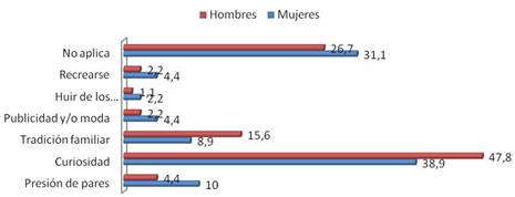 Las personas entrevistadas reportaron haber consumido por primera vez algún tipo de SPA entre los 11 y 16 años (78% entre hombres y mujeres). Las razones para iniciar el consumo se pueden observar en la Figura no. 1.