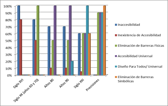 También aparecen instituciones que favorecen la transformación y el paso a una visión de la accesibilidad más inclusiva. Algunas, como el Instituto Europeo para el Diseño y la Discapacidad (EIDD), en 1993 con la finalidad de aumentar el Bienestar Social y la calidad de vida de las personas a través del design for all. De la misma manera, en 1994 se destaca como hecho relevante la realización del Seminario Iberoamericano de Accesibilidad al Medio Físico en Río de Janeiro, en el que se contempla el análisis de la accesibilidad universal dejándola obsoleta en relación al diseño para todas las personas. A partir de estos momentos se comienza a poner el foco de atención, además, en a quien va dirigida la accesibilidad. Abriendo, a partir de aquí la puerta que permitiría analizar la accesibilidad y el diseño desde una perspectiva holística a partir de la que enmarcar la accesibilidad en un plano que contemple a toda la población (Arjona, 2015).