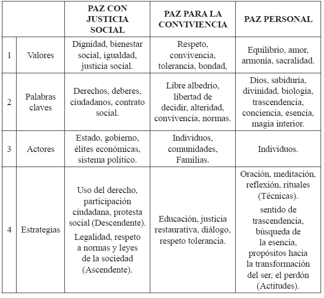 Desde el discurso de los docentes se identificaron tres tipos de paz que dan cuenta de una semántica cotidiana, sencilla y práctica, propia de las representaciones sociales como simplificadores de la complejidad conceptual y estructural de las ideas de los educadores. Esta clasificación se realizó con base en diferentes aspectos que delimitaban y al mismo tiempo lograban describir las particularidades que cada paz tiene en relación con los conflictos, la violencia, los actores, el poder y la estrategia. Estas paces se denominaron así: Paz con Justicia Social, Paz para la Convivencia y Paz Personal. Y aunque resaltan las diferencias, estas paces se articulan, se construyen y deconstruyen mutuamente (Ver Tabla 1).