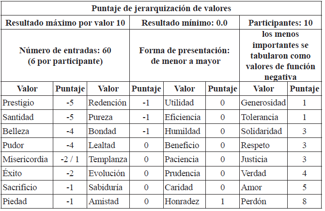El instrumento consistió en recolectar treintaidós valores éticos asociados al tema de la paz y la educación por/hacia la paz: posteriormente el participante seleccionó la mitad de ellos y descartó el resto; este procedimiento se repitió cuatro veces hasta escoger un solo ítem, a fin de observar mediante una selección progresiva y una escala de jerarquización los valores de los participantes, clasificando los que tienen mayor o menor importancia. Posteriormente se hizo con los entrevistados un análisis de los tres valores más relevantes y los tres menos relevantes que fueron descartados en el primer grupo de dieciséis; los valores de menor importancia tuvieron un valor negativo en el momento del procesamiento. Esta técnica permitió inferir la cercanía y lejanía de ciertos valores ya que, como lo dice la teoría psicosocial escogida, puede usarse interpretando el rango medio de cada ítem, considerando la correlación positiva o negativa frecuencia/rango como indicador de elementos centrales de las representaciones (Araya-Umaña, 2002).