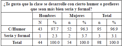 Para iniciar, el mencionado cuestionario interrogó de forma clara y directa sobre si les gustaba que la clase se desarrollara con cierto humor o más bien fuera seria y formal, y la mayoría (96.9%) apuntaron que les gusta que la clase se desarrolle con cierto humor (Tabla 1).