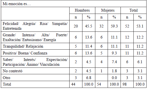 El siguiente paso del continuum del proceso emocional es la emoción en sí, a lo cual la respuesta de más del 50% de la muestra fue de “felicidad, alegría, risa, simpatía, entretenida” (53.1%), para a continuación a mucha distancia señalar que la emoción, o mejor dicho mencionar el grado de intensidad de la emoción misma, “grande, intensa, alta, fuerte, exaltación, entusiasmo, energía” (12.2%). Esto seguido por (11.2%) “Tranquilidad, relajación” y (11.2%) “Positiva, buena, confianza” (Tabla 10). Cuestiones que son fundamentalmente emociones, o incluso el grado, nivel o intensidad de las mismas que va en sentido de entusiasmo y energía.