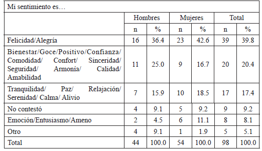 En este caso, la emoción se toma como reacción emocional y el sentimiento como la duración y nombramiento de la misma, según Damasio (2010). Por lo que la emoción reactiva fue felicidad y alegría en mayor número, seguida de su intensidad --pues es la reacción emocional, repetimos- y luego considerar la emoción de tranquilidad y juzgarla como positiva. En el sentimiento, también en primer lugar, aunque cuantitativamente en menor medida, se menciona la alegría y felicidad, en segundo el bienestar y lo positivo de la emoción, y en tercero la tranquilidad. Con lo cual hay bastantes semejanzas. Más que los términos nombrados lo que diferencia sentimiento de emoción es el número de respuestas contabilizadas, lo cual hace suponer que en general empleamos ambos vocablos, (sentimiento y emoción) como equivalentes y, de hecho, así lo hacemos en la vida cotidiana, más allá del análisis académico o ciertos enfoques del mismo. Lo que sí queda claro, es la concentración del número de respuestas en la emoción de felicidad y alegría, seguida por intensidad. Mientras en el sentimiento disminuye esta emoción inicial para dar paso al bienestar y la armonía con calma y tranquilidad.