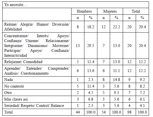 Se hizo otra pregunta en la cual se solicitaba una explicación sobre cómo satisfacía esa necesidad. Transcribimos algunos relatos para ilustrar las explicaciones que sobre ello se dieron. “Prestando atención para reírme y analizar si el chiste está relacionado con el tema”, “algunos ejemplos con un poco de gracias”, “estar sentado, a gusto, rodeado de la gente con quien me llevo mejor”, “poner atención, aunque la clase sea de humor es necesario poner atención”, “integrarme en el humor y participar expresándome”, “reírme cada vez que algo me parece chistoso”, “participando con buen humor”, “hablar con amigos”, “las clases son dinámicas y mi mente se centra en lo que estamos haciendo aunque no lo parezca”, “participar con un poco de humor y chistes en clase o alguna otra anécdota”, “lo dinámico de la clase me permite estar relajado y percibir los datos y conocimientos de un modo que ayuda a retenerlos mejor”, “teniendo una actitud positiva y tener ganas de aprender cosas nuevas”, “relajándome y entreteniéndome”, “concentrarme”, “participar más”, “pasar un rato excelente”, “al tomar la clase con humor hace que algo que se enseñe sea más fácil de digerir y así sea capaz de aprender más”, “recordar lo aprendido en clase y asociarlo con el tema”, “riéndome, estando en movimiento”, “viviendo la clase, tomando apuntes, recordando las dinámicas, bromas al momento de repasar por mi cuenta”, “una buena relación en el grupo”, “poner atención”, “trato de asociarlo con algo divertido para después recordarlo”, “poniendo atención sin estrés”, “bromear con algunas situaciones”, “salirme de la rutina”, “haciendo que aprenda de una manera fácil y cómoda porque me llevo buenos recuerdos”, “estando relajado y sin presiones, siempre es bueno ver una cara sonriente frente al grupo”, “al estar en una clase en la que pones atención es más fácil estar concentrado”, “hacer las clases más emotivas y divertidas”, “estar más atento y participar más”, “aprendo y pongo atención”, “poniendo atención a clase”, “conocer mejor a los compañeros”, “la clase para mí es perfecta, no necesito nada más”, “poner atención en la clase”, “tener más confianza”, “seguir enfocada”, “al asociar los conocimientos con situaciones que tienen cierto nivel de humor es más fácil recordarlos y no sólo memorizar”, “la satisfago al entrar a la clase con gusto y poner más atención a lo que se explica”, “soy seria, venir a clase en la mañana y sentirme alegre y cómoda hace que sonría”.