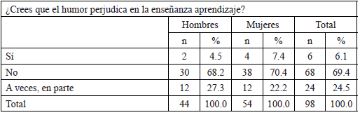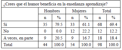 En el otro extremo respecto a los posibles beneficios, 69.4% -exactamente el porcentaje que había dicho que no había perjuicios-apuntó que el humor sí beneficiaba en el proceso de enseñanza aprendizaje, mientras 12.2% dijo que no beneficiaba -lo cual duplica la cifra de los que habían afirmado que sí perjudicaba- y finalmente también aumentó el “a veces” y “en parte” (18.4%) (Tabla 14). Como se observa la mayoría apunta a los beneficios, sin olvidar también la matización de los mismos.