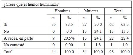 Añadir que, como varios autores señalan (Berger, 1999; Kanovich, 2007) el humor humaniza, no obstante, quisimos interrogar al respecto a la población de la muestra y los resultados fueron que algo más de dos tercios de la misma (63.3%) dijo que sí, 13.3% dijo que no, y 22.4% que a veces y en parte (Tabla 15). Cuando en un interrogante anterior se preguntó sobre en qué beneficia alguien respondió que “fomenta la participación, crea mayores condiciones de igualdad, al sentir la clase más humanizada”.