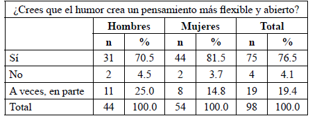 Y hablando de beneficios, una buena parte de la juventud interrogada así considera y juzga al humor en la educación como benéfico para el proceso de enseñanza aprendizaje, si bien hay quien apunta algún perjuicio. Además, el humor humaniza y favorece la creatividad y flexibilidad del pensamiento con lo cual, y como se ha venido insistiendo en este texto, el humor hace que se esté y se sienta bien, toda vez que motiva el aprendizaje y lo ameniza.