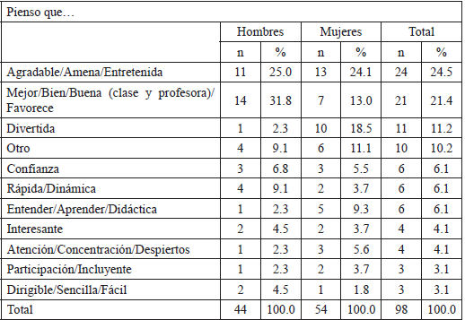 En primer lugar, a la pregunta de lo que piensan, ciertos porcentajes de expresiones giraron en torno a dos cuestiones, una de ellas es “Agradable, amena, entretenida” (24.4%) y otra es “Mejor, bien, buena, favorece” (21.4%). Por lo que se trata de que al estar en una clase con humor y risa piensan que es buena y amena. Luego, pero con menor número de respuestas apareció el que es “Divertida” (11.2%) (Tabla 2). Ante la diversión se antepone el que sea agradable, buena y mejor.