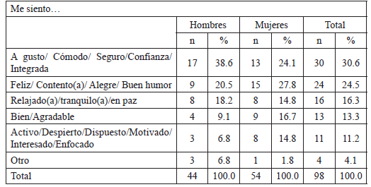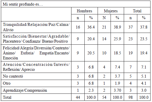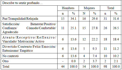 Finalmente, en esta batería de preguntas u oraciones incompletas, se volvió a insistir en el sentir profundo al solicitar que lo describieran. De nuevo, como en el anterior interrogante, ya que es el mismo, pero se reitera y añade una descripción, apareció en primer lugar, y con porcentaje similar (31.6%), “Paz, tranquilidad, relajada”, seguida también del mismo campo semántico “Satisfacción, bienestar, positivo, confianza, cómodo, confortable, agradecido”, en tercer lugar, apareció “Atento, receptivo, reflexivo, vinculado, motivación, activo” (18.4%) (Tabla 7). En fin, que parece reafirmarse el sentir profundo en su descripción, y que va en el sentido de tranquilidad y bienestar, fundamentalmente, como ya se mostró.