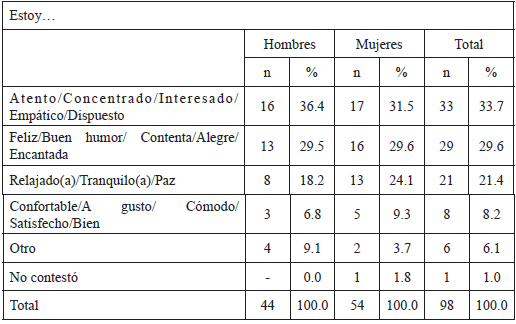Otra pregunta gira en torno al sentir profundo en la situación descrita, y de nuevo en primer lugar, aunque en un porcentaje algo menor (37.8%) señalaron “Tranquilidad, relajación, paz, calma, alivio”. Luego, con 23.5%, apuntaron a “Satisfacción, bienestar, agradable, placentero, confianza, bueno, positivo”. También hubo quien expresó “Felicidad, alegría, diversión, contento, ánimo, euforia, empatía, encanto, emoción” (19.4%) (Tabla 6). Relajación y bienestar predominan.