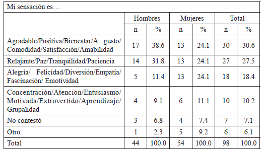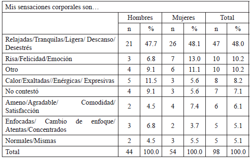 La siguiente pregunta era sobre las sensaciones corporales que experimentaba en esas circunstancias, y de nuevo aparece la sensación de estar “Relajadas, tranquilas, ligeras, descanso, desestrés” (48.0%), con casi la mitad de la población que de esa manera contestó, lo cual señala la importancia de dicha sensación en las circunstancias descritas. Luego dijeron también otras cuestiones, aunque en menor número, por ejemplo, 10.3% afirmó que su sensación era “Risa, felicidad, emoción” (Tabla 5). Aquí el papel de la relajación de manera notable.