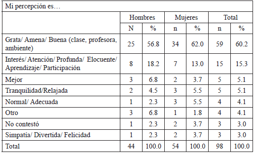 En primer lugar, se interrogó sobre cuál era su percepción. Dos tercios de las respuestas obtenidas (60.2%) apuntaron que “grata, amena, buena (clase, profesora, ambiente)”, en segundo lugar, y a bastante distancia (15.3%), expresaron que su percepción es de “Interés, atención, profunda, elocuente, aprendizaje, participación” (Tabla 8). Lo cual significa que el humor y la risa se perciben como gratos y positivos, toda vez que hacen que su percepción esté atenta e interesada en el aprendizaje. En todo caso, en la percepción predomina la mirada de lo emocional, aunque también lo cognitivo.