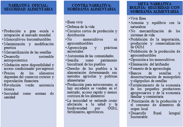 Por lo tanto, en la presente investigación se analizan tres versiones de mecanismos de atención al hambre y la desnutrición: la política nacional de “Seguridad Alimentaria” como narrativa oficial, la contra-narrativa de la “Soberanía Alimentaria” que proponen los movimientos sociales campesinos, éticos y populares y las estrategias de seguridad y soberanía alimentaria para un “Vivir Bien” implementadas en Bolivia como referencia de una posible meta-narrativa.