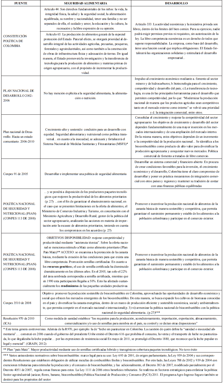 La narrativa oficial de la Seguridad Alimentaria en Colombia, claramente permeada por un enfoque liberal del desarrollo, privilegia el productivismo, mediante producción a gran escala, OGM y la integración al mercado mundial. Desde esta perspectiva, filial de los principios de la “Revolución Verde” y funcional al nuevo régimen alimentario corporativo, otras apuestas de desarrollo como los monocultivos y la agroindustria de biocombustibles se presentan como compatibles con la Seguridad Alimentaria. Claramente este discurso del desarrollo está atravesado por imaginarios moderno-occidentales tales como la visión lineal del tiempo, el determinismo tecnológico, la separación ser humano naturaleza, mercantilización de la naturaleza y los alimentos, la racionalidad instrumental, el individualismo y el antropocentrismo.