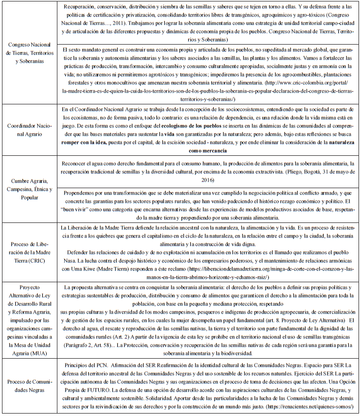 En el Foro de Desarrollo Agrario Integral convocado por PNUD30 y la Universidad Nacional empiezan a confluir movimientos sociales y se gesta la actual Cumbre Agraria, Campesina, Étnica y Popular (2014), movimiento derivado de la unión de los grupos subalternos en su disposición de generar política pública de abajo-arriba. Dentro de sus pliegos aparece el principio del “buen vivir” y la economía propia frente al modelo de desarrollo neoliberal extractivista, el reconocimiento del agua como derecho fundamental para el consumo humano, la defensa de la producción de alimentos para la soberanía alimentaria y la recuperación de semillas nativas.