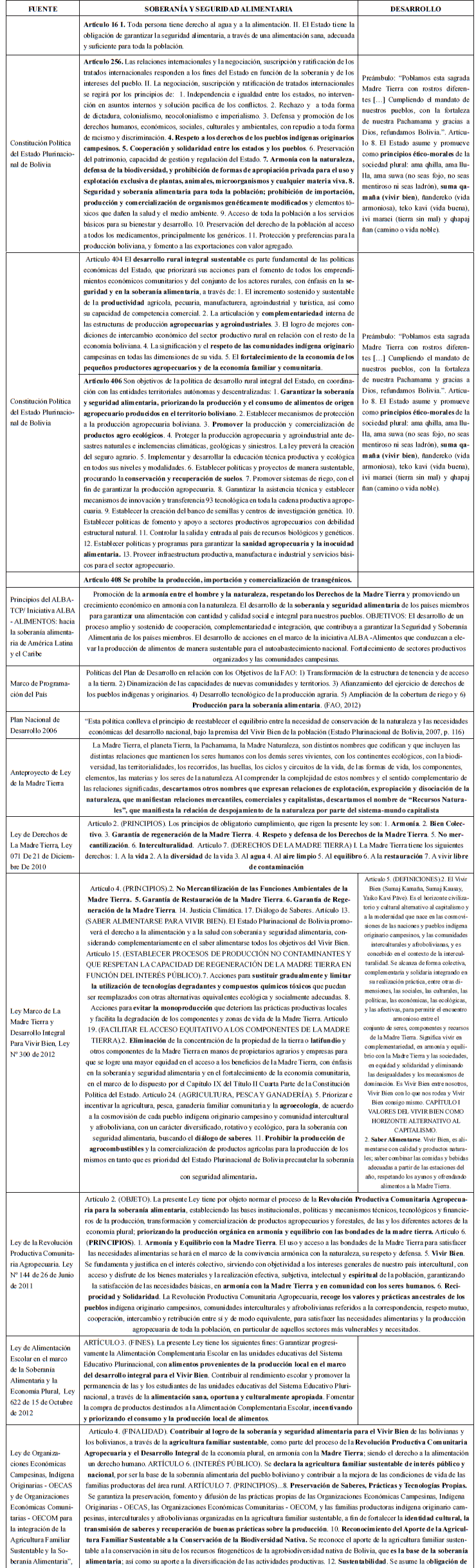 Así se configura una narrativa institucional que busca compatibilizar, al menos en el discurso, Vivir Bien, Seguridad y Soberanía Alimentarias y los derechos de la Madre Tierra. En efecto, las prescripciones sobre soberanía alimentaria en Bolivia no pueden entenderse por fuera de las innovaciones de la Constitución de 2009 que revalora la diversidad cultural, reconoce el estatus sagrado de la Madre Tierra e incorpora el “Vivir Bien” (suma qamaña) como principio ético-moral central de la sociedad y de la organización económica del Estado.