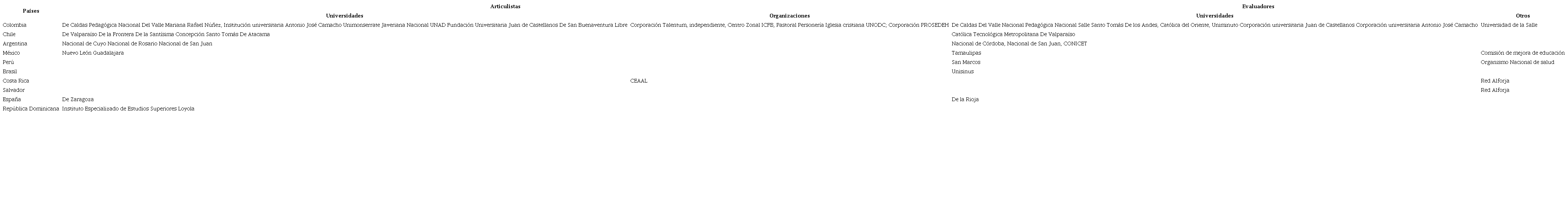 El siguiente cuadro sintetiza procedencias y afiliaciones de quienes nos vinculamos al proceso editorial en el tema central, desde 39 instituciones universitarias y 13 organizaciones de 10 países. Las dobles afiliaciones y nacionalidades de algunos participantes, dan cuenta de los procesos de globalización.