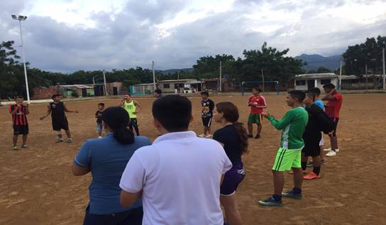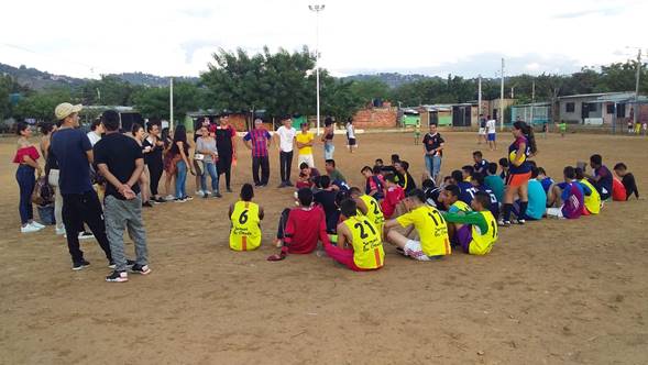Los encuentros adelantados por parte de los estudiantes de Trabajo Social con los jóvenes pertenecientes a la Escuela Jaime Garzón e incluso con algunos integrantes de sus familias, se realizaron en tres horas semanales durante 14 semanas que es el tiempo estipulado por cada semestre; se acudió a estrategias como el fútbol para transformar la competencia por el trabajo en equipo, los insultos por el diálogo y también la importancia de la escucha y el respeto hacia el otro; es menester señalar que dos de los estudiantes que realizaron su intervención comunitaria con el grupo en el segundo semestre del 2019, terminaron integrándose a la Escuela Jaime Garzón lo que se ve como un aspecto bastante significativo, pues hoy aportan desde su formación al fortalecimiento del proyecto colectivo. El proceso ha sido clave para que las personas reconozcan la presencia de problemáticas, pero también, vean la necesidad de idear estrategias que permitan dar solución a las mismas por más difíciles que resulten. En la siguiente figura se puede evidenciar la participación de los integrantes de la Escuela en la realización de una de las actividades de los estudiantes de Trabajo Social. (Figura 4)