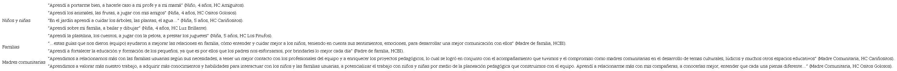 Yo aprendí a colorear, a compartir los juguetes, a portarme bien. (Niño, 5 años, Hogar Comunitario Divino Niño).