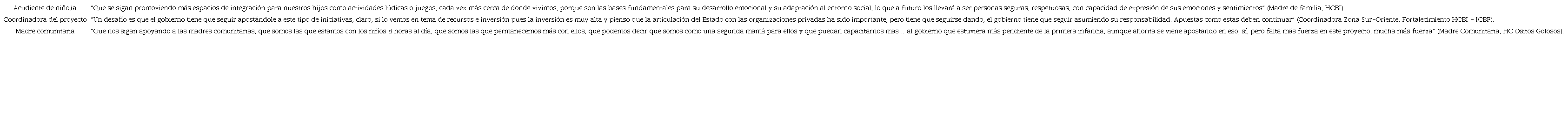Siento que ha avanzado mucho, que ha tenido un avance gigante desde que instalaron la política de primera infancia en el país, mejoras, pero también faltan cosas, no solo desde presupuesto y parte económica sino desde el compromiso de las instituciones, de hacer en realidad un seguimiento a éstas y a los niños, no solo durante el proceso en el servicio sino después de salir. (Auxiliar de Enfermería, Fortalecimiento HCBI)