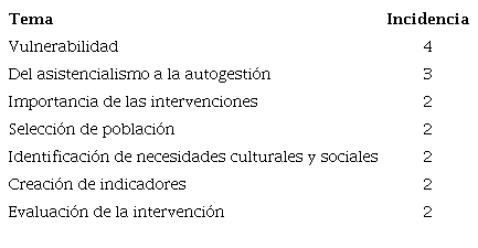 Durante el debate y la mesa de trabajo se presentaron los resultados de la revisión de literatura sobre intervenciones socioeducativas, factores de vulnerabilidad de la población, prácticas de intervención en grupos vulnerables en el contexto de Chihuahua y las dificultades en relación a las diversas necesidades y características de los destinatarios de dichos grupos; también se abordaron temáticas como la colonización mediante la educación y los problemas éticos que enfrentan los interventores. El análisis de las percepciones de los participantes dio como resultado la creación de tres dimensiones: Vulnerabilidad, Construcción de comunidad, y Autopercepción de los interventores