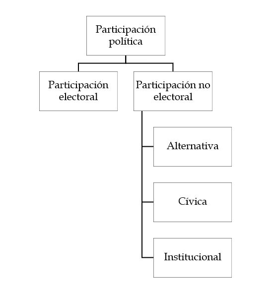 Tomando como base estos dos sistemas, el autor define tres tipos de participación: la participación electoral (participación convencional), relacionada con procesos como el sufragio universal; la política no electoral, regularmente antagónica y que se subdivide en participación alternativa y participación cívica, la primera, relacionada con formas de participar alternativas no ligadas a canales institucionales (mítines, protestas, redes sociales, denuncia ciudadana); la segunda, que se refiere a la pertenencia a grupos y organizaciones de participación voluntaria (ambas, formas de participación no convencionales). Esta última, de acuerdo con el autor, no busca siempre construir demandas que sean procesadas por el sistema político, sino que tiene un componente simbólico. A estas tres categorías, la investigación añadió una cuarta que surgió como categoría emergente luego de un proceso de análisis normativo y de las entrevistas: la participación institucional, la cual se da en los canales que el poder ejecutivo, tanto a nivel nacional como territorial, crea para dialogar con la ciudadanía. La Figura 1 muestra, gráficamente, esta clasificación de dos categorías.