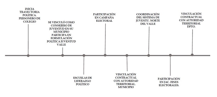 Posteriormente, esta experiencia le permitió vincularse a una campaña electoral al apoyar a un candidato a la alcaldía, el cual, una vez obtenido el triunfo, lo nombró miembro del gabinete departamental al vincularlo contractualmente con la administración municipal. Al hacer parte del cuerpo burocrático, siguió ejerciendo actividades relacionadas con temas de juventud y fue nombrado coordinador del sistema departamental de juventudes en 18 municipios del norte del departamento. Nuevamente las coocurrencias se hacen presente en este caso de estudio, pues las diversas formas de participación política están presentes siempre de manera paralela.