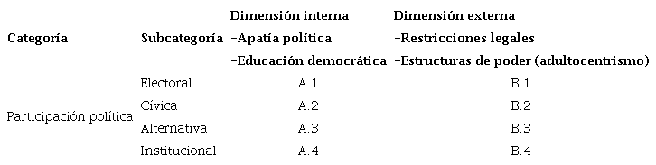 Para el análisis de los resultados se empleó el software Atlas.ti con el objetivo de realizar codificación abierta3 relacionando dos aspectos: por un lado, las categorías de participación previamente expuestas (participación electoral, participación alternativa, participación cívica y participación institucional); por el otro, a partir de la construcción del problema en la investigación, se encontró que la participación política se mediaba en dos dimensiones, una interna y una externa. La primera, refiere al componente subjetivo del sujeto (creencias, postura hacia la política, creencias, desconfianza a las instituciones, formación democrática, etc); la segunda, se refiere a componentes objetivos (restricciones legales de participación política electoral4, estructuras de poder adultocentrista5). La Tabla 1 muestra la relación entre las categorías de participación y las dimensiones.