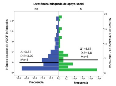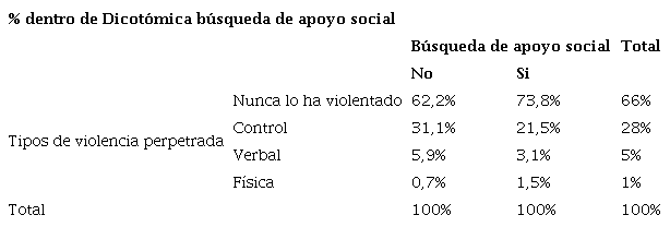 Con el fin de analizar con mayor profundidad la dinámica de victimización y perpetración de violencia según la búsqueda de apoyo social, se compararon nuevamente los mismos datos para el subgrupo de mujeres que informaron VGCP (n=200) comparando el grupo Si-AS (n=65) con el grupo No-AS (n=135), de ahí que las prevalencias señaladas anteriormente en el segundo párrafo de hallazgos varíen.
