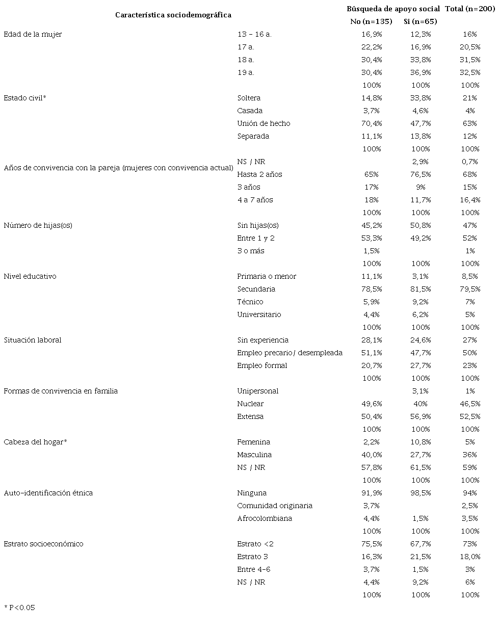 Al comparar las prevalencias totales de cada variable sociodemográfica según la búsqueda de AS (Tabla 1), en el grupo No-AS se encontró que eran mayoritariamente adolescentes menores de 17 años, eran madres que convivían con el agresor en familias nucleares con cabeza de hogar masculina. No contaban con experiencia laboral, estaban desempleadas o informaron de empleos precarios y sus niveles educativos eran inferiores respecto a los informados por el grupo Si-AS. De acuerdo con el estrato socioeconómico, siendo que la mayoría de la submuestra se ubicó en niveles bajos (<2=73%) las adolescentes del grupo No-AS estuvieron más representadas tanto en los estratos inferiores (<2=75,5%) como en los estratos superiores (total submuestra estrato entre 4-6 =3% vs. estrato entre 4-6 para No-AS=3,7%). Según auto-identificación étnica, todas aquellas que se reconocieron procedentes de comunidades originarias no buscaron apoyo (3,7%), así como las afrocolombianas, que también quedaron más representadas en este grupo (total submuestra afrocolombianas=3,5% vs. afrocolombianas No-AS=4,4%).