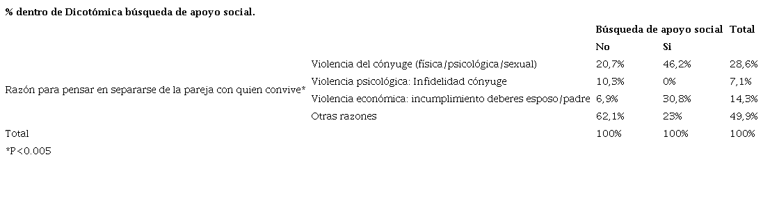Al detenerse en los casos de las adolescentes que convivían con el agresor para indagar el inicio de la violencia perpetrada contra ellas (n=134), el 69% informó que la misma comenzó antes de cumplir un año de convivencia en pareja y el 5,5% durante el noviazgo. El 33,1% había pensado en separarse. El grupo Si-AS asoció el 77% de las razones a la violencia de género que perpetraba la pareja contra ella. Así la violencia física, psicológica y/o sexual fue la causa principal informada (46,2%), seguida de la violencia económica, expresada como incumplimiento de los deberes de esposo/padre (30,8%). En el grupo No-AS las razones asociadas a la VGCP supusieron un 37,9%, de las cuales el 20,7% refirió la violencia física psicológica y/o sexual, el 10,3% la violencia psicológica manifestada como infidelidad masculina y el 6,9% por la violencia económica (Tabla 2). El contraste Chi-cuadrado reveló que el tener pensamientos de separación por la VGCP se asoció a la búsqueda de AS, si bien la magnitud fue baja.