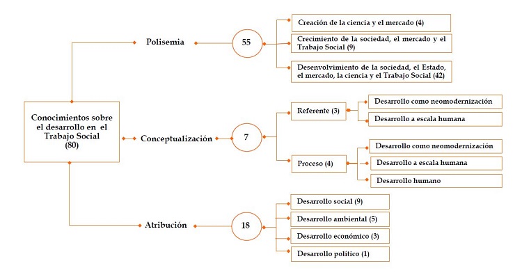 En lo concerniente a la polisemia, el desarrollo se instala 55 veces con tres acepciones: (i) creación de la ciencia y del mercado (4); (ii) crecimiento de la sociedad, el mercado y el Trabajo Social (9); y (iii) desenvolvimiento de la sociedad, el Estado, el mercado, la ciencia y el Trabajo Social (42).