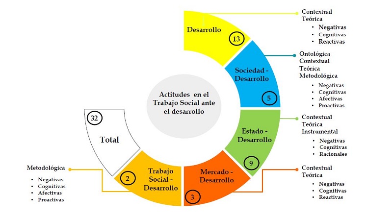 A su vez, en ese corpus, se inscriben 32 posturas (negativas, cognitivas, racionales, afectivas, proactivas y reactivas) frente al desarrollo impuesto en Latinoamérica y Colombia, así como ante los enlaces de este con la sociedad, el Estado, el mercado y el Trabajo Social en sus dimensiones ontológicas, contextuales, teóricas, metodológicas e instrumentales, especialmente, por sus nefastos resultados, efectos e impactos en diversos grupos de la sociedad y la naturaleza.