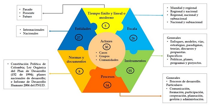 En el corpus documental se precisan las prácticas del Trabajo Social en materia del desarrollo 183 veces, por cuanto se demarcan sus tiempos, escalas, actores, procesos, instrumentos, normas, documentos y entidades, justo como se dilucida en las siguientes partes (Figura 4).