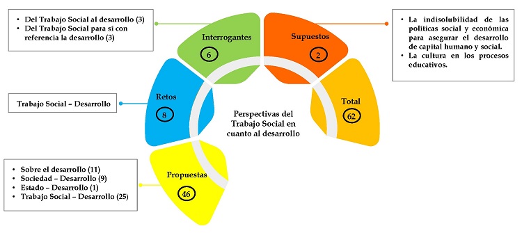 En el corpus documental se introducen 62 perspectivas del Trabajo Social sobre el desarrollo en forma de proposiciones, retos, interrogantes y supuestos (Figura 5).