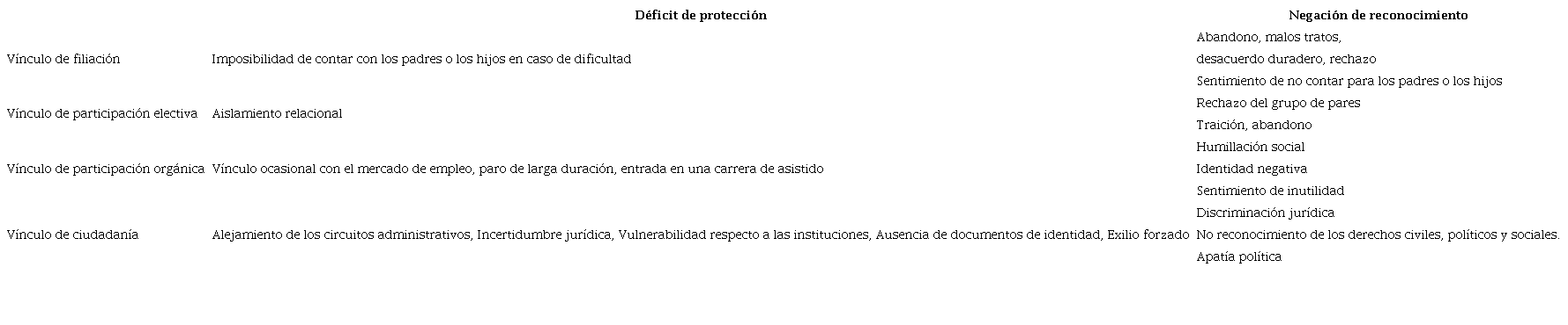 Así pues, se presentan en la Tabla 1 los puntos claves de la ruptura y opresión de los 4 tipos de vínculos sociales expuestos por Paugam (2008):